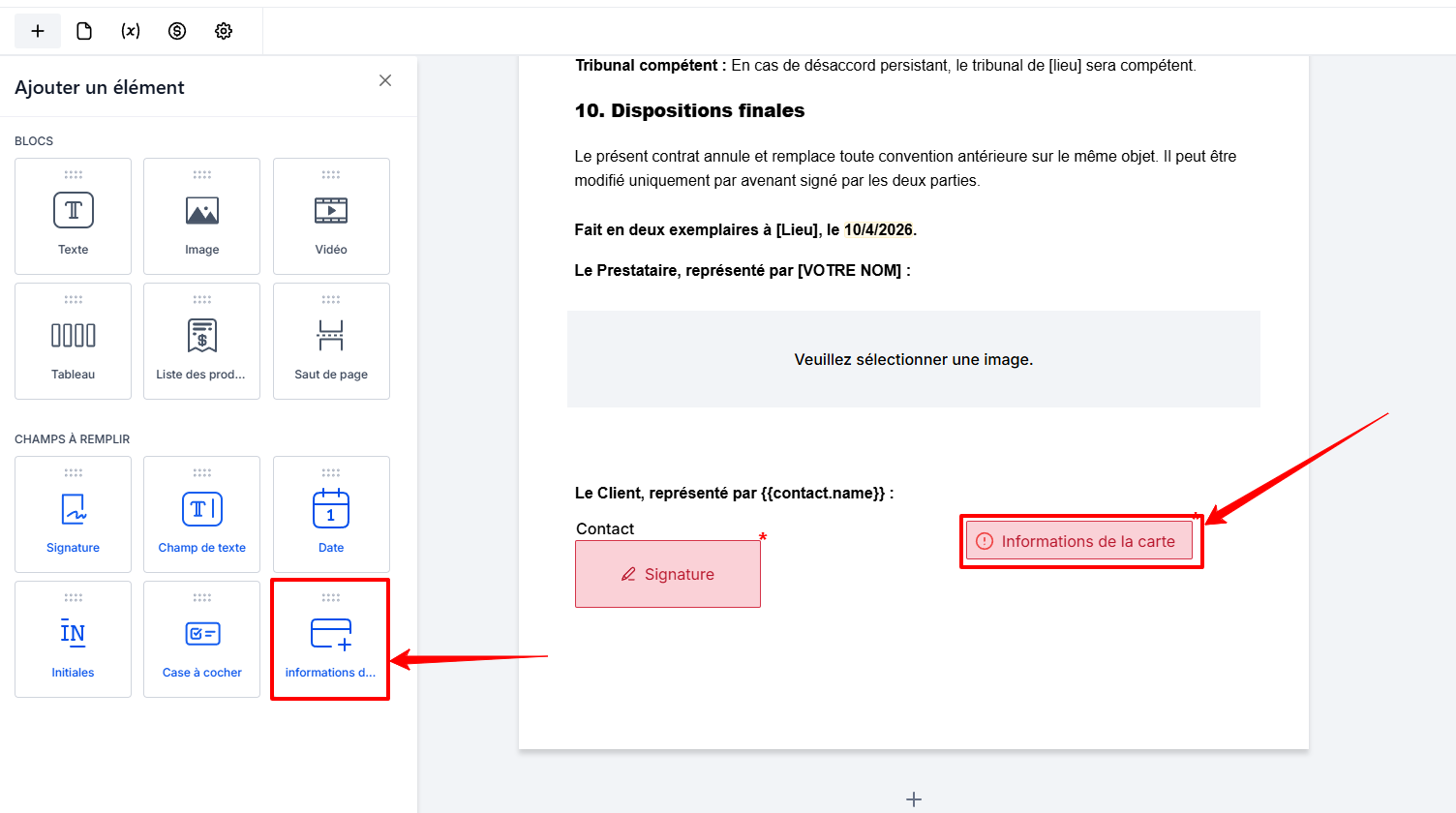 Un nouveau champ "Coordonnées de carte" est disponible dans l'éditeur de Documents & Contrats. Il s'insère comme n'importe quel autre champ — nom, adresse, case à cocher, signature. Le signataire le remplit au moment de compléter le document.