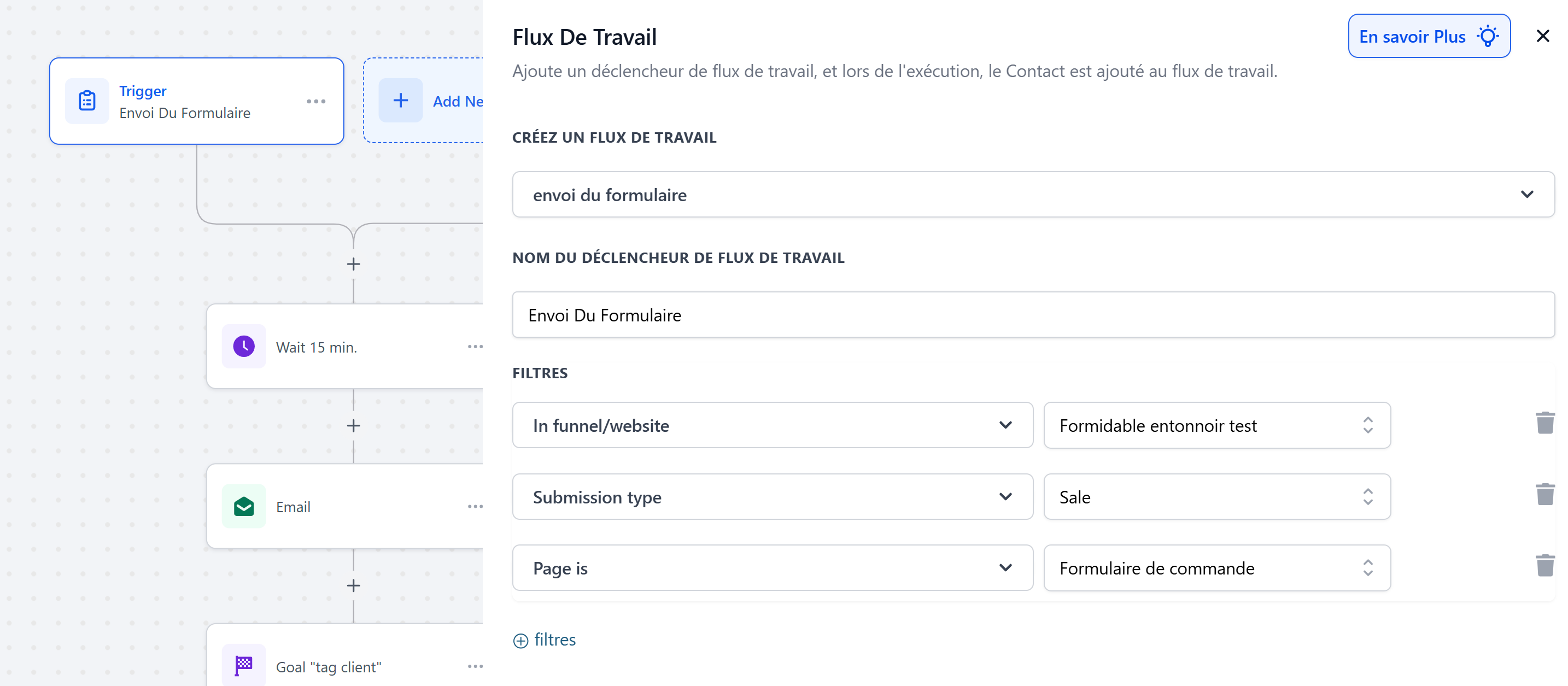 You can then be more specific by adding "page is" and "submission type" so that automation only triggers in the event of a sale, and not when the first step of the form is completed (opt-in).