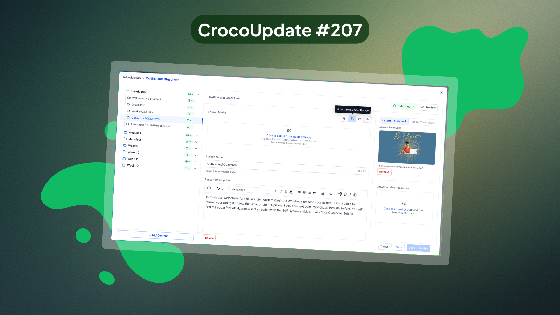 Vous pouvez désormais ajouter des fichiers audio et vidéo à vos leçons directement depuis le stockage multimédia, sans téléversement supplémentaire.