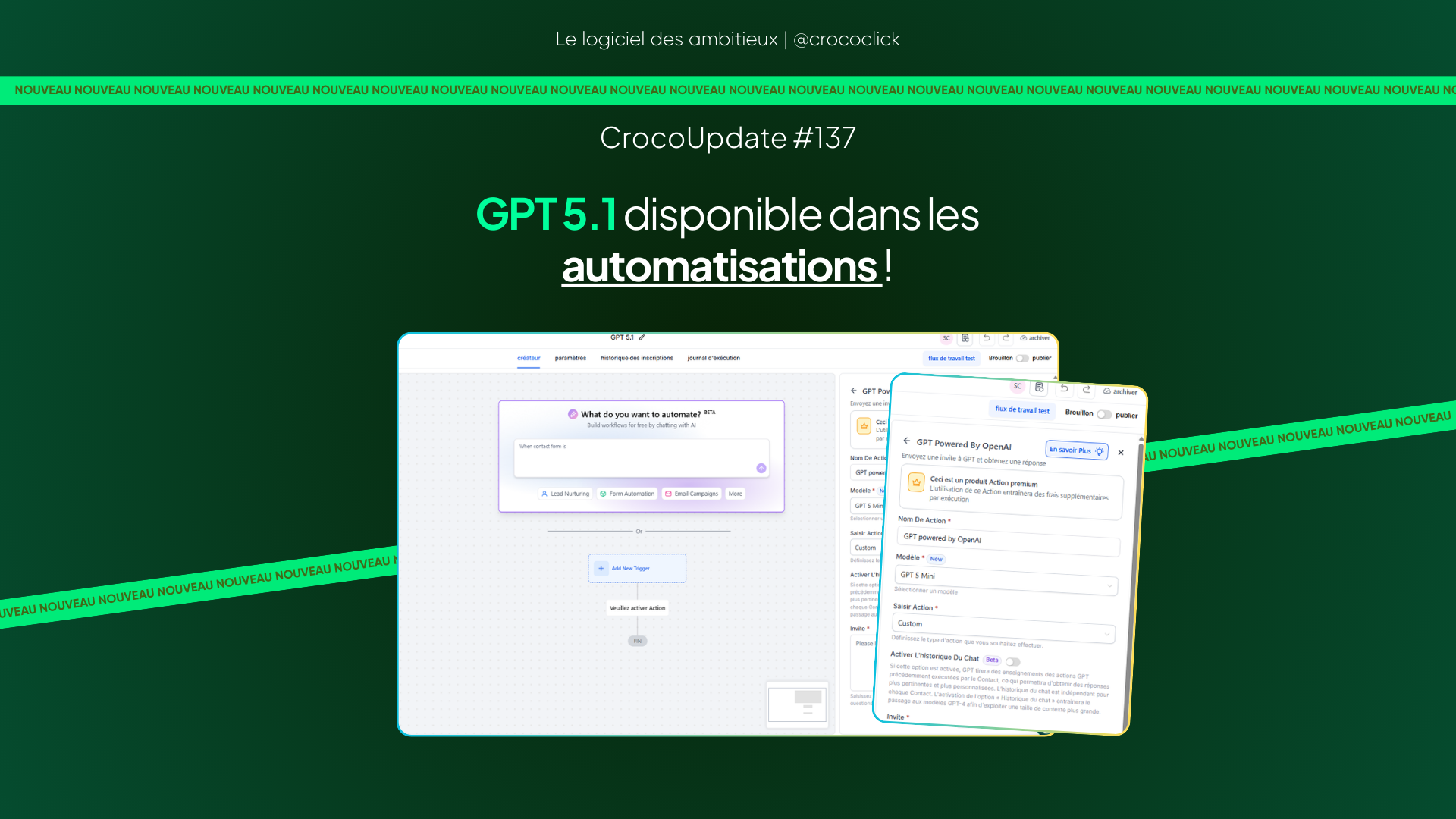 GPT 5.1 est maintenant disponible dans toutes vos automatisations CrocoClick. Essayez-le dès aujourd’hui pour booster l’intelligence de vos workflows !