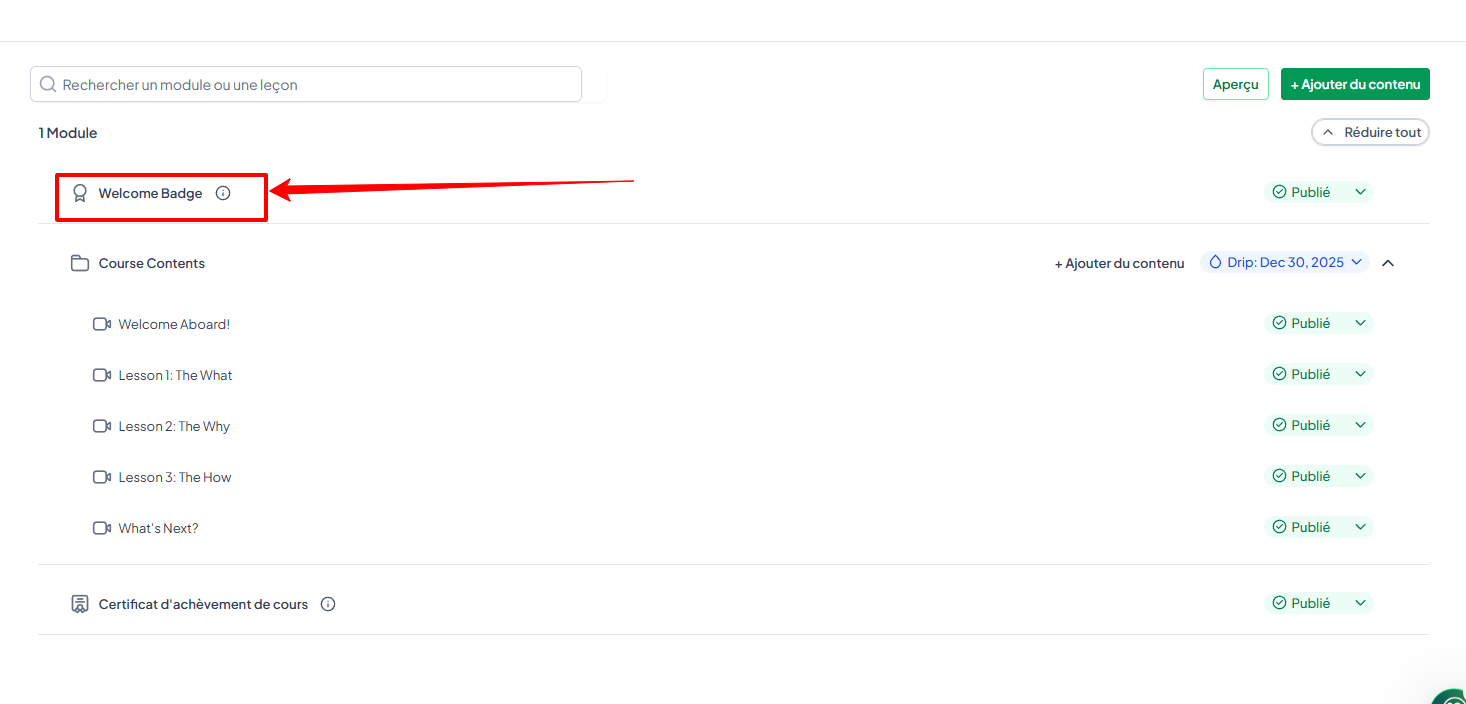 ce badge est déjà préconfiguré dans le cours