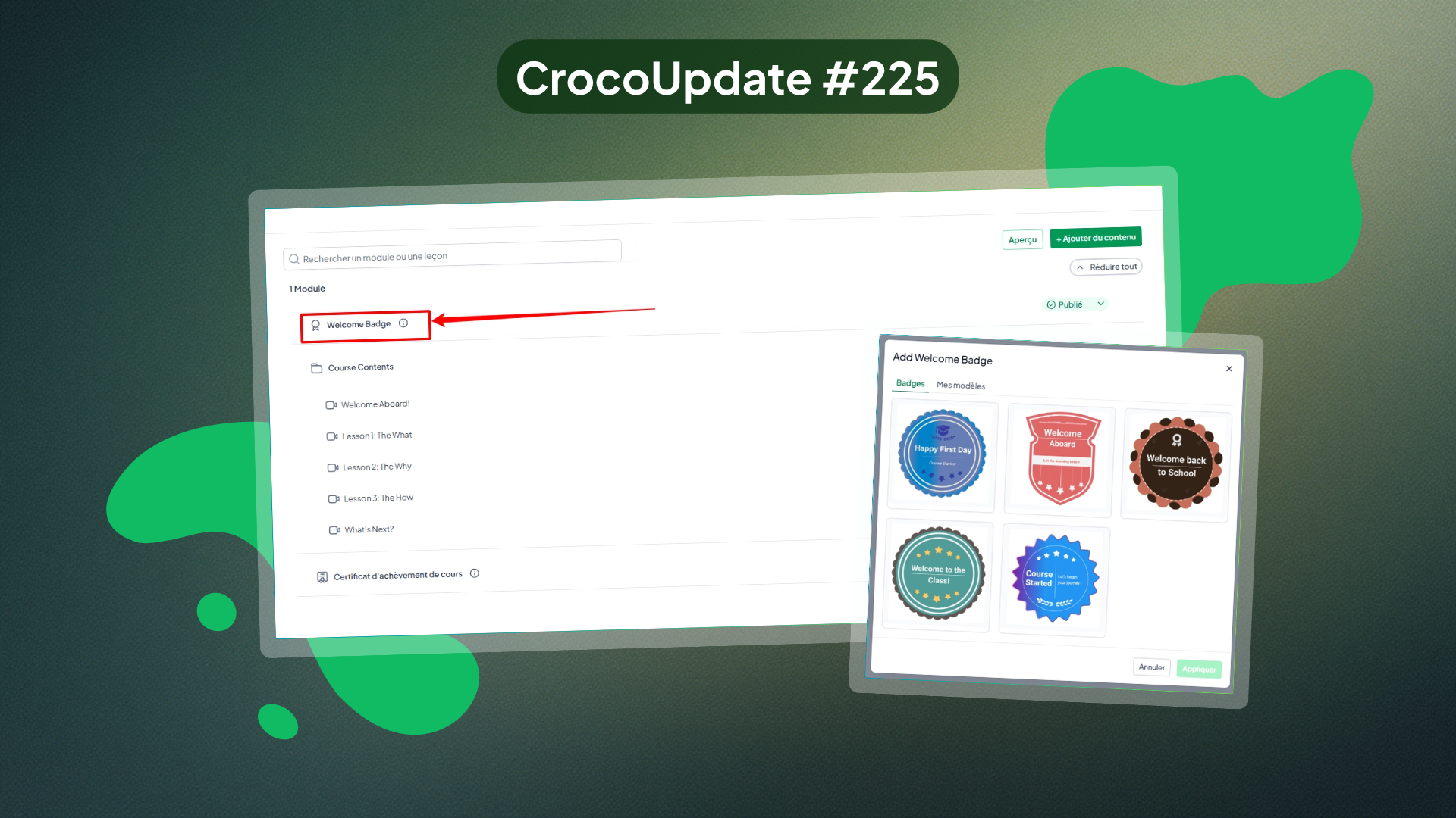 Cette amélioration permet de renforcer l’expérience dès les premières secondes, en accueillant chaque apprenant avec un badge sans effort, tout en gardant une configuration simple et maîtrisée.