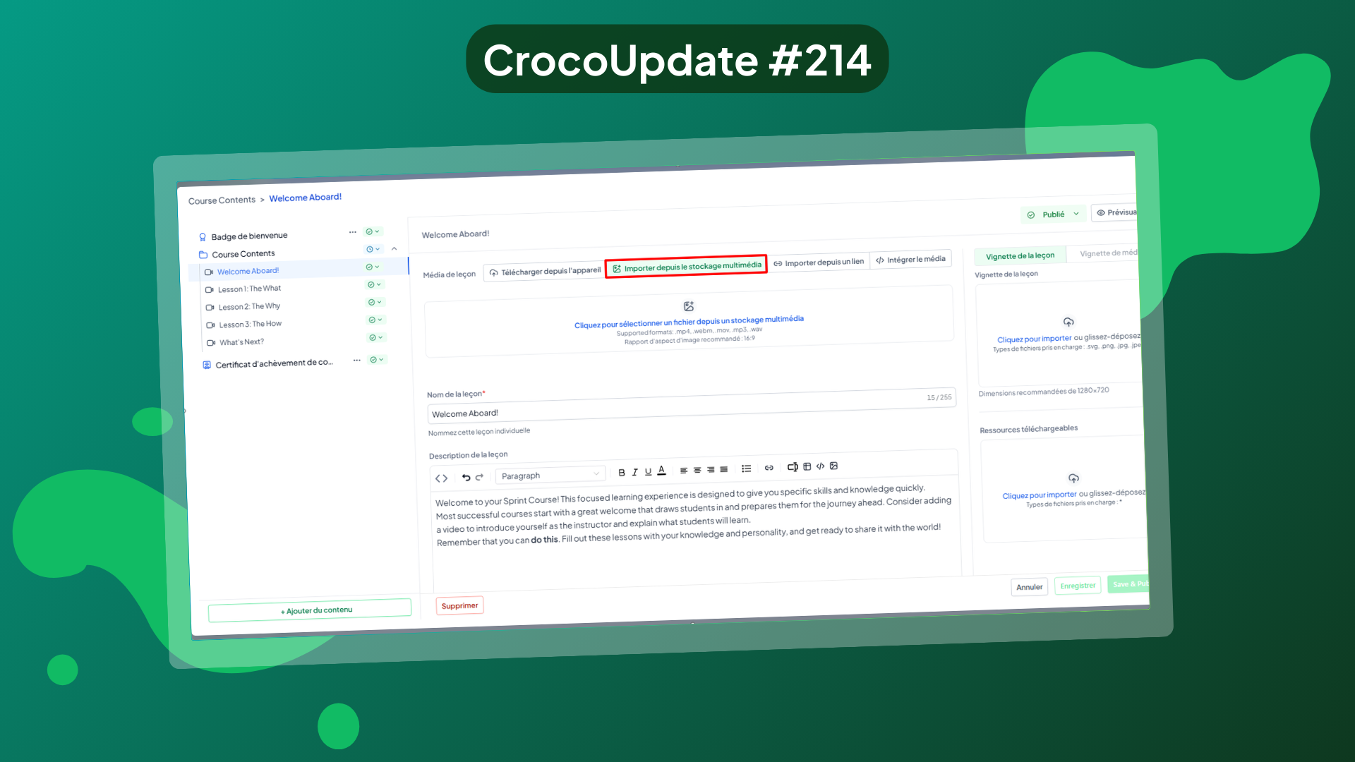Vous pouvez désormais importer des fichiers directement depuis le stockage multimédia dans vos leçons, sans avoir à téléverser à nouveau vos contenus.