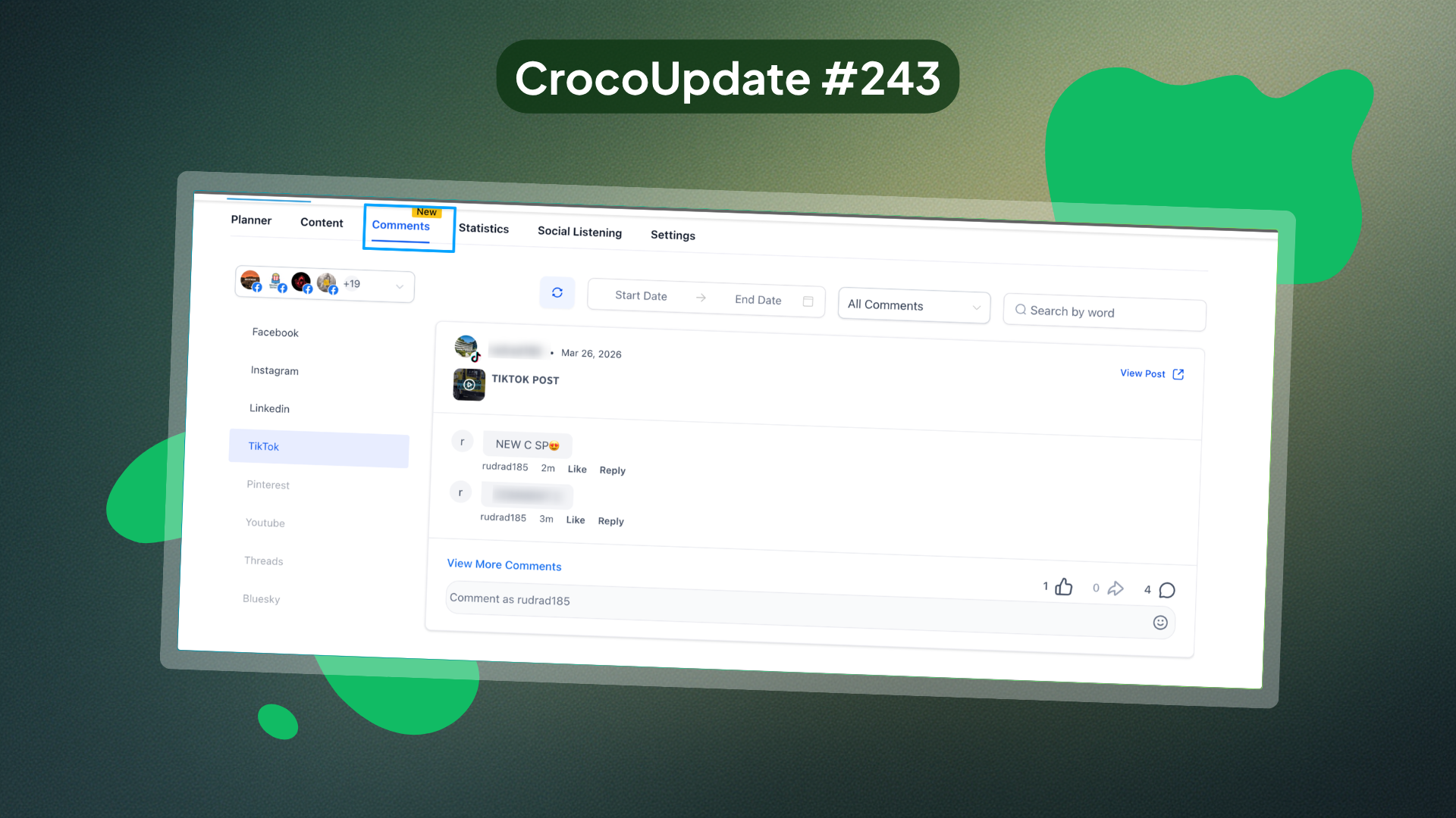 TikTok rejoint les réseaux gérés dans Comment Management. Vos commentaires TikTok — et ceux de vos clients si vous gérez leurs comptes — sont visibles et accessibles directement depuis le Social Planner, sans jongler entre deux outils.